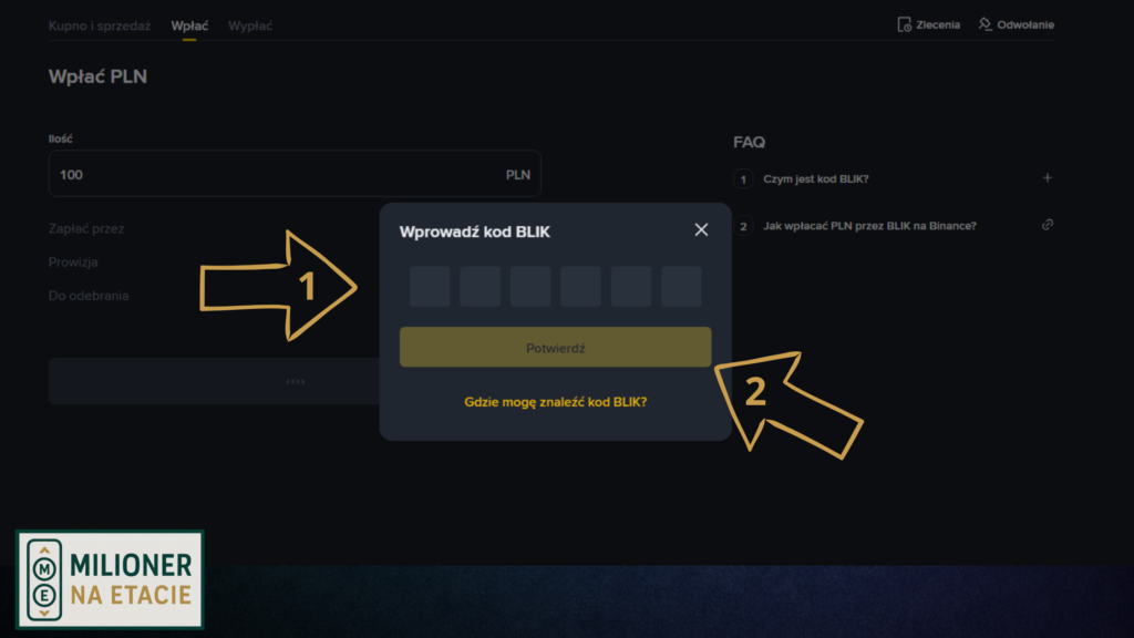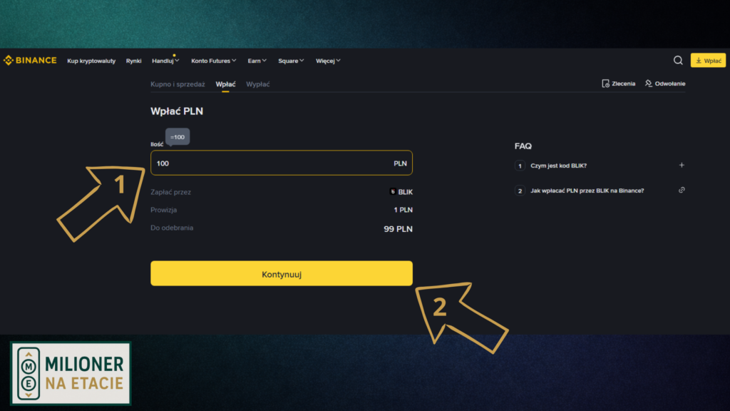 Binance umożliwia wpłatę złotówek przez BLIK. Wpisujesz kwotę, w naszym przypadku 100 zł. Prowizja wynosi 1 PLN, więc na konto giełdowe trafi 99 zł. Cena za wygodę, bo pieniądze pojawiają się natychmiast.