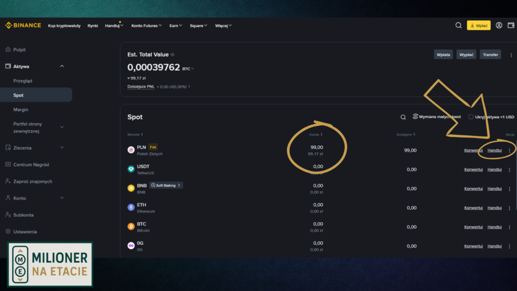 100 zł. Konto na giełdzie. Weryfikacja. Wpłata. Zakup na giełdzie Spot. Portfel. Seed phrase. Przelew na własny adres.