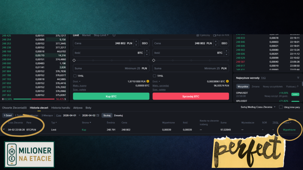 Zlecenie trafia na giełdę. Jeśli ktoś zaakceptuje Twoją cenę (a przy małej kwocie to kwestia sekund) zobaczysz w historii zleceń status: Wypełnione.
