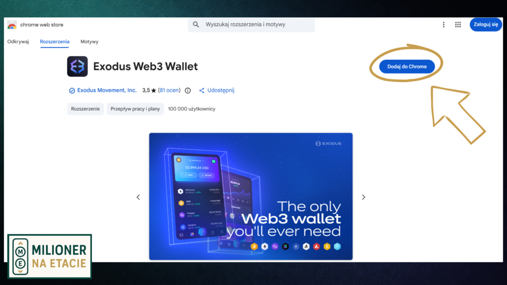 Wchodzimy do Chrome Web Store i instalujemy oficjalne rozszerzenie Exodus Web3 Wallet. Sprawdź wydawcę — powinien być Exodus Movement, Inc.