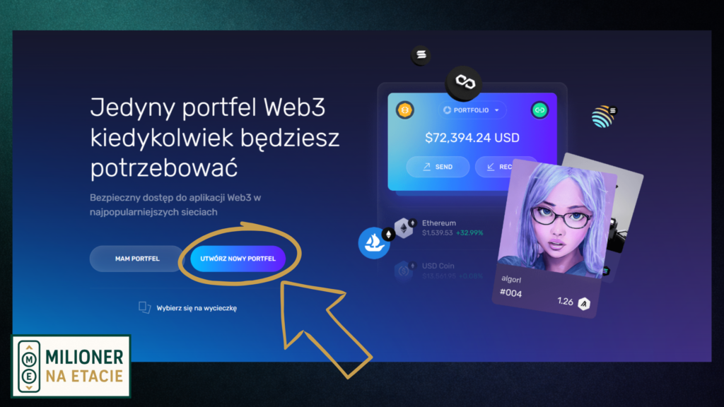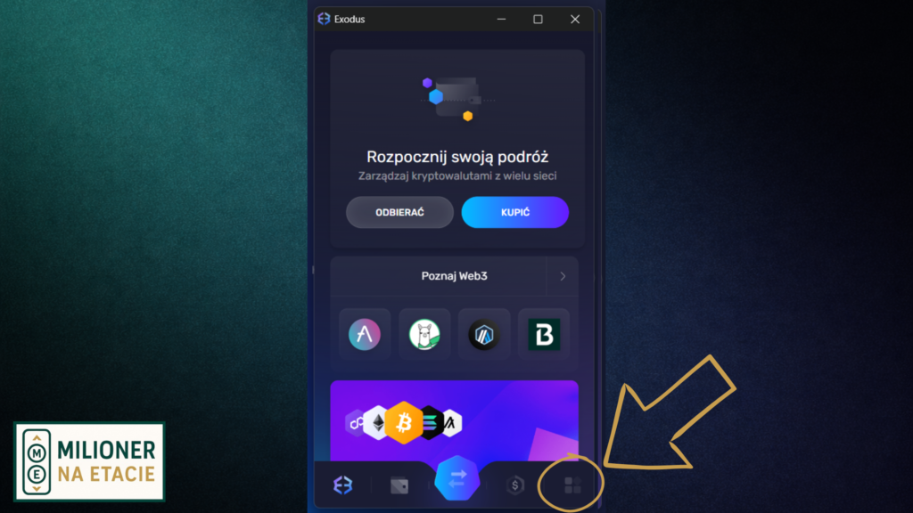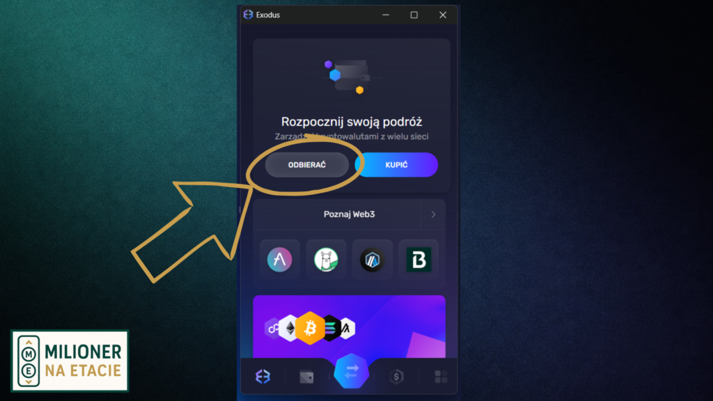 Używamy Exodus — darmowy portfel dostępny jako rozszerzenie do Chrome, aplikacja desktopowa i mobilna. Prosty interfejs, obsługuje Bitcoina i setki innych krypto.