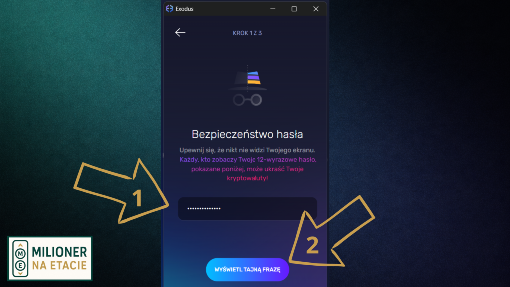 Klikasz „Wyświetl tajną frazę”. Exodus pokaże Ci ostrzeżenie. Upewnij się że nikt nie widzi Twojego ekranu.