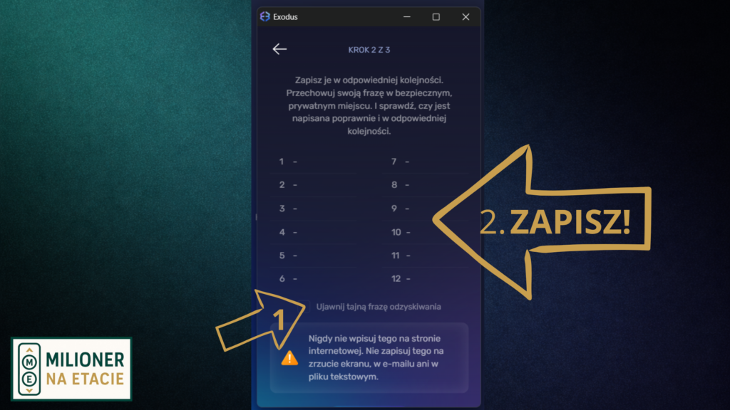 Na ekranie pojawi się seed phrase — 12 losowych słów w języku angielskim. To jest Twój klucz do portfela. Twoje jedyne „hasło”. Jedyny sposób żeby odzyskać dostęp do krypto jeśli stracisz komputer.