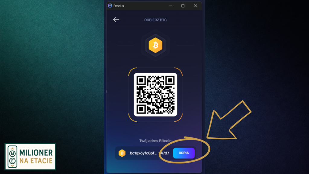 Zobaczysz swój adres portfela, długi ciąg liter i cyfr oraz kod QR. Kliknij „Kopiuj”.