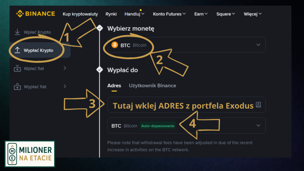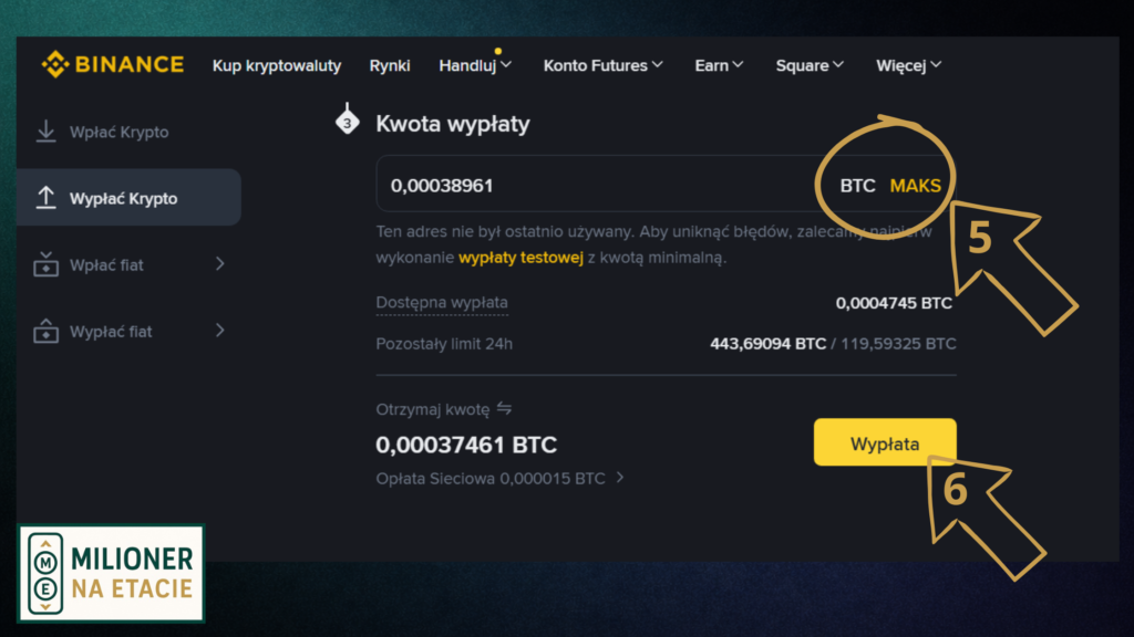 Teraz wracasz na Binance. Wchodzisz w swój portfel, wybierasz Bitcoin i klikasz „Wypłać”.
