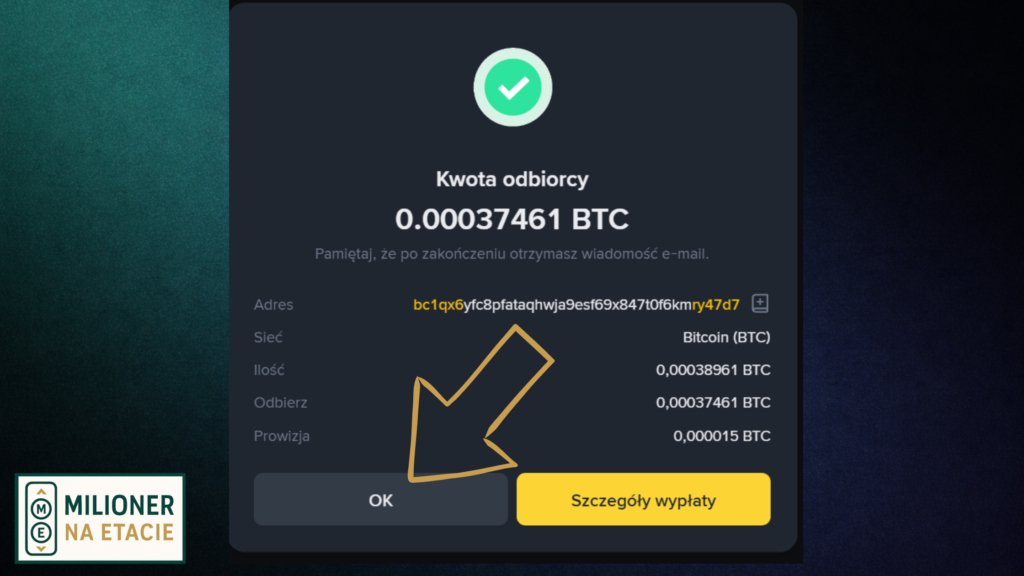 Klikasz „Kontynuuj”. Binance może poprosić o potwierdzenie mailem lub kodem 2FA. To dodatkowe zabezpieczenie. Po zatwierdzeniu… zielony komunikat z potwierdzeniem kwoty.