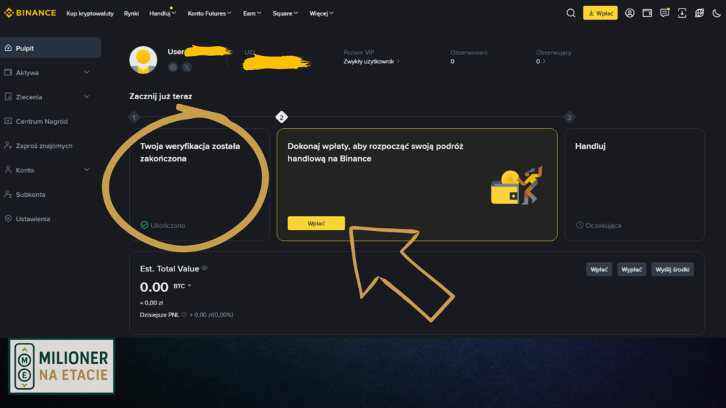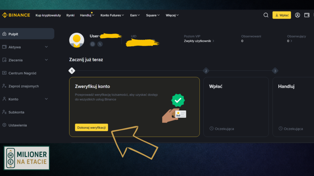Po zalogowaniu widzisz panel który prowadzi Cię za rękę: Zweryfikuj konto, Wpłać, Handluj.