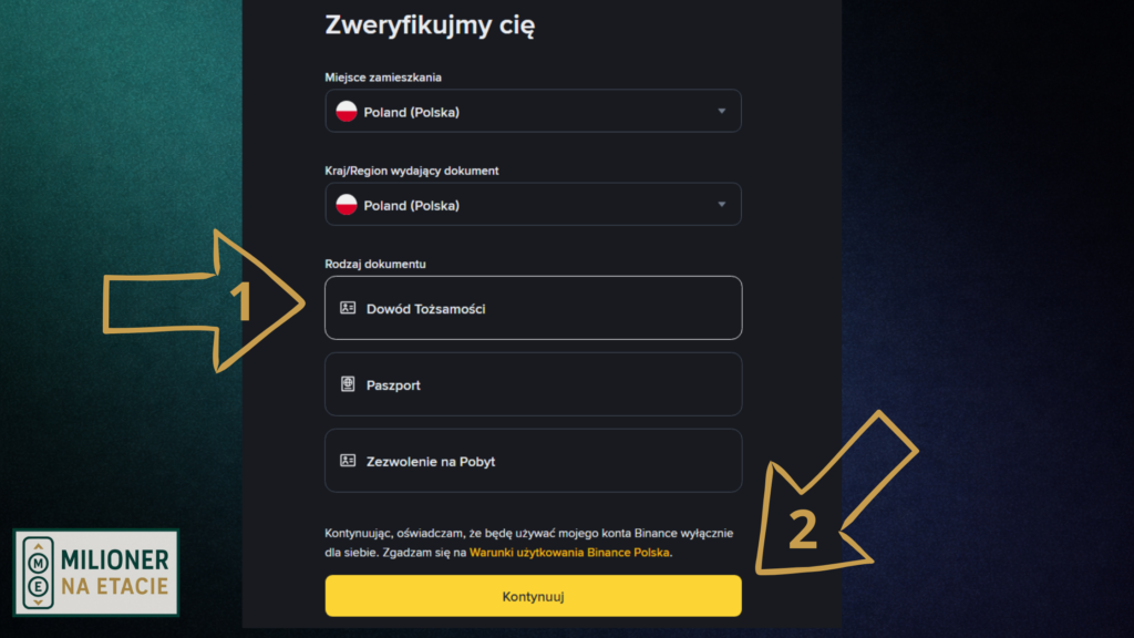 Klikasz „Dokończ weryfikację”. Wybierasz Polskę i rodzaj dokumentu: dowód osobisty, paszport lub zezwolenie na pobyt.