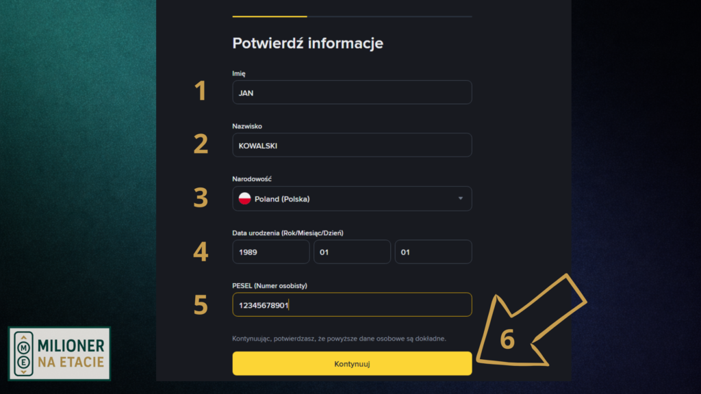 Podajesz swoje dane osobowe: imię, nazwisko, data urodzenia, PESEL.