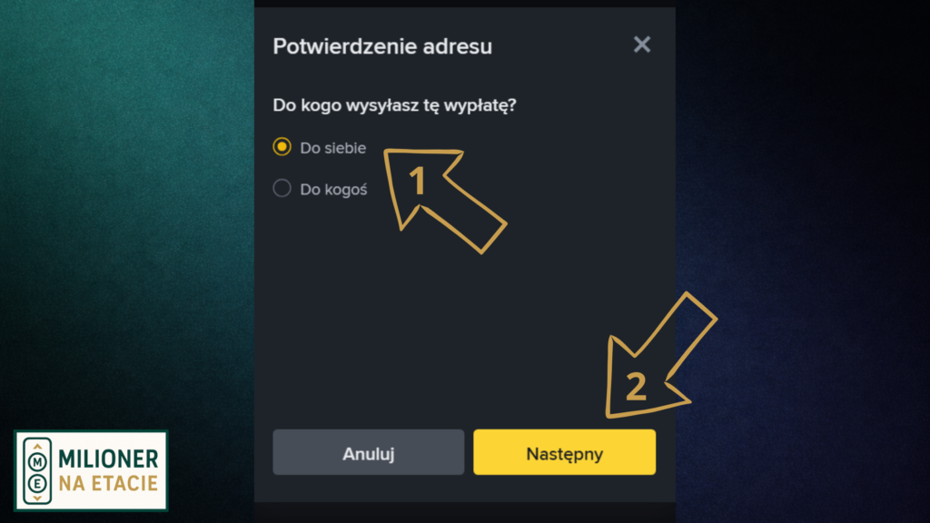 Klikasz „Wypłata”. Binance zapyta Cię do kogo wysyłasz — zaznaczasz „Do siebie”.