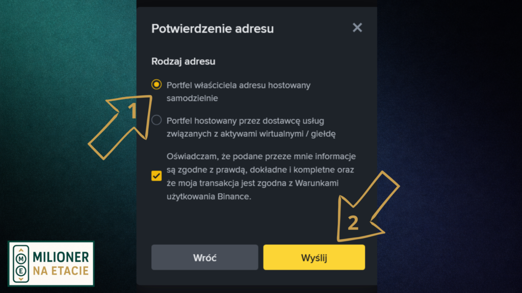 Następnie potwierdzasz że to portfel hostowany samodzielnie (nie na giełdzie).